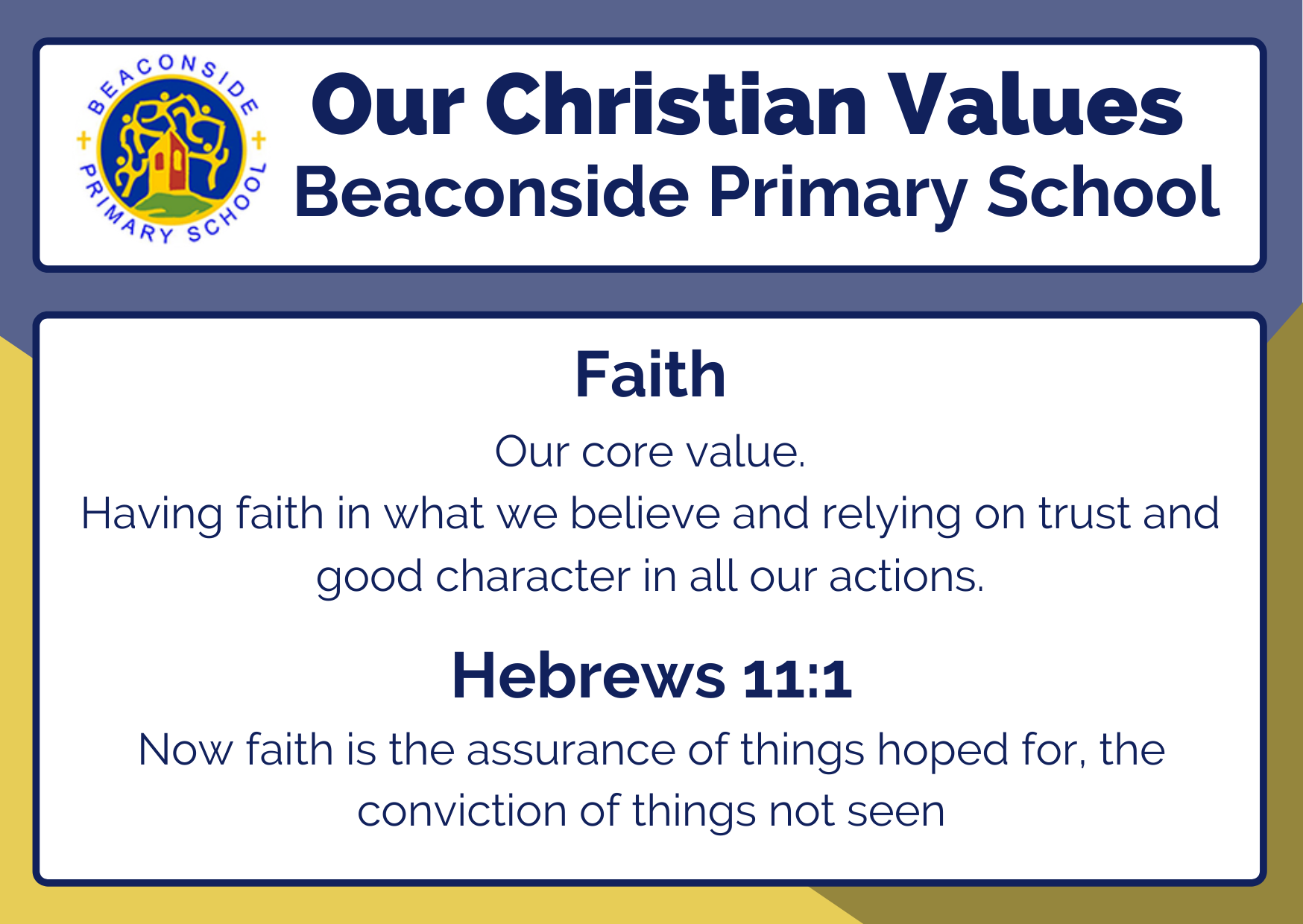 • Faith – developing curiosity, reflection and respect, as we explore Christian faith and learn about the beliefs of others.