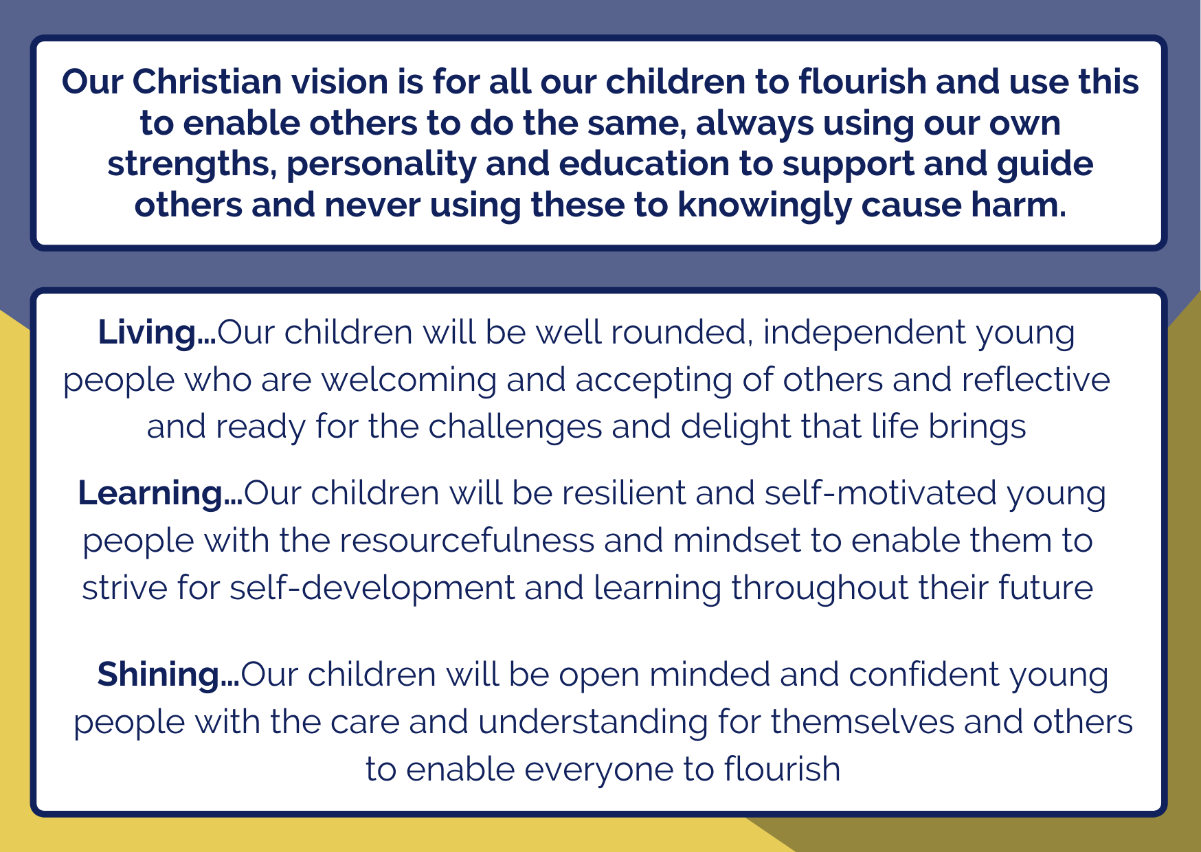 Rooted in our Christian foundation, we want every child to understand and value the place they come from, while also being encouraged to look beyond it — to embrace their ambitions, dreams and God-given potential. We believe that education should open doors, nurture confidence and inspire hope, enabling children to live well in the present and step boldly into the wider world.